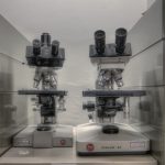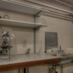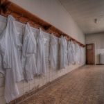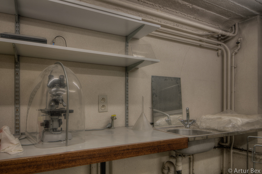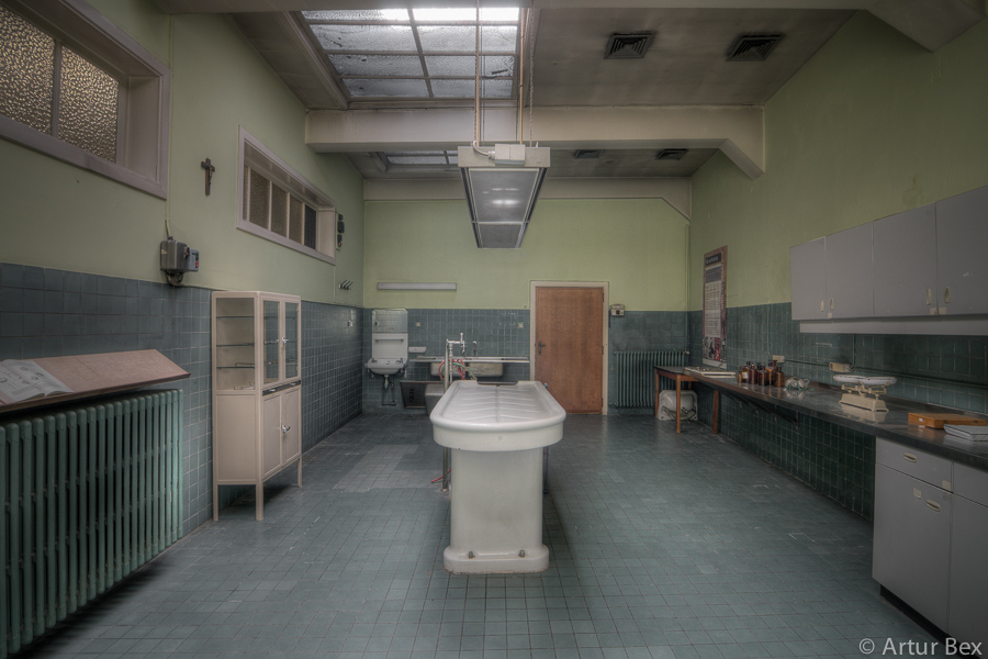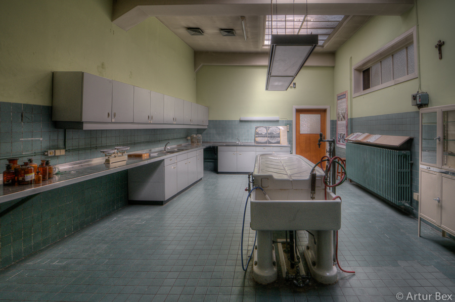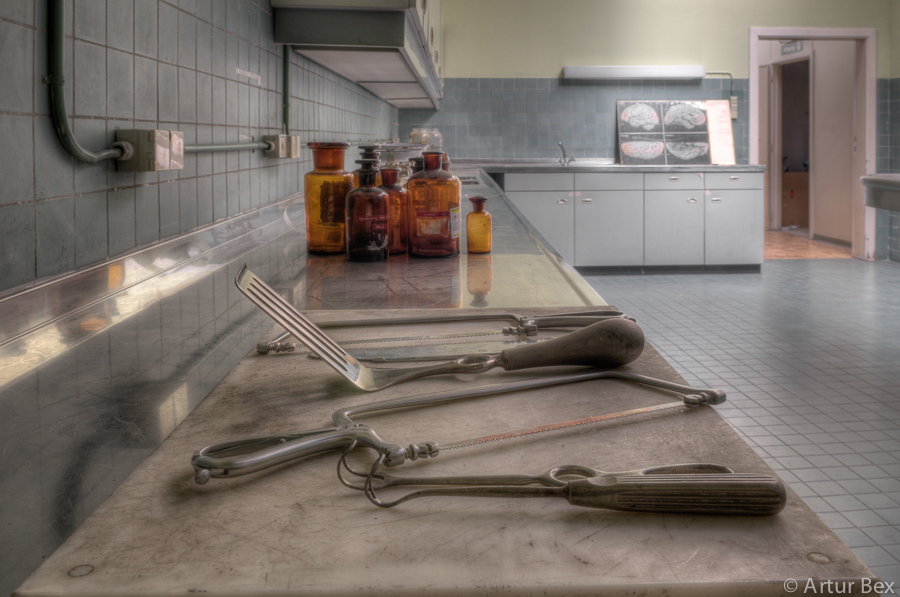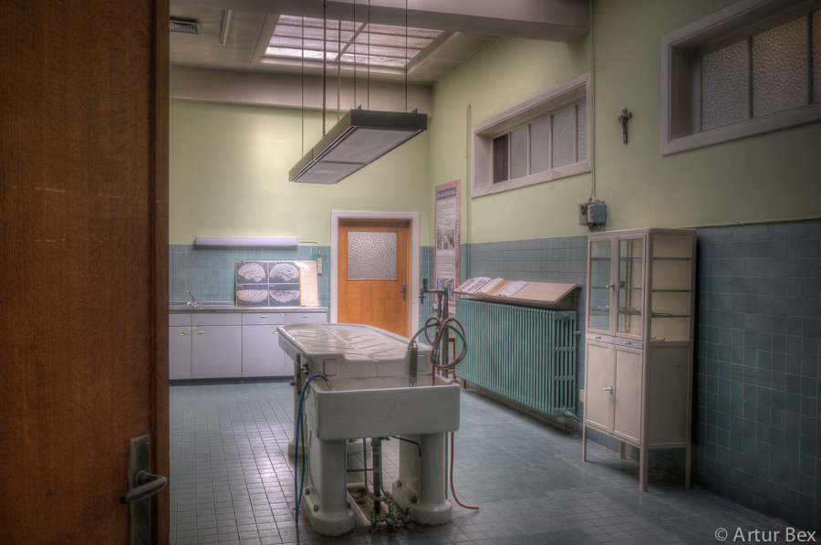 Een vervallen plaats was dit geenszins, deze anatomieruimte was wel verlaten. De snijtafel stond bijna te glanzen, de schorten aan de kapstokken. De paspop achter de deur, in doktersuniform, deed dienst als vogelschrik. Ik moet bekennen, met succes, want ik verschoot me haast een bult toen ik stilletjes het hoekje omdraaide en in een oogopslag iemand zag staan. Betrapt was het eerste wat door mijn gedachten schoot. Een plausibele uitleg vinden een bijna tweede….maar voordien had ik door dat het een pop was.
