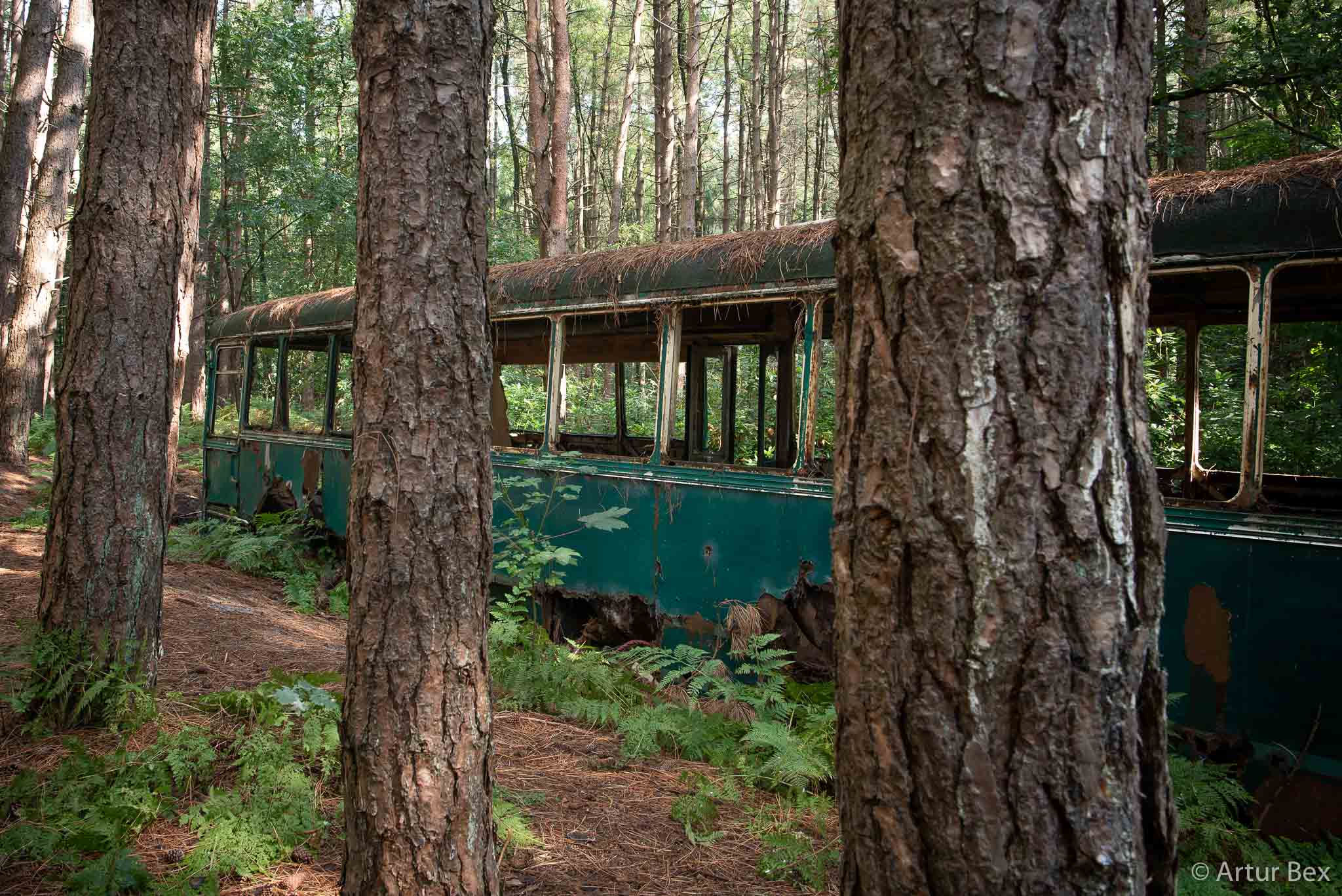 Was de bus er eerst en groeide het bos eromheen of liet iemand een Dinky Toy achter die zomaar begon te groeien.